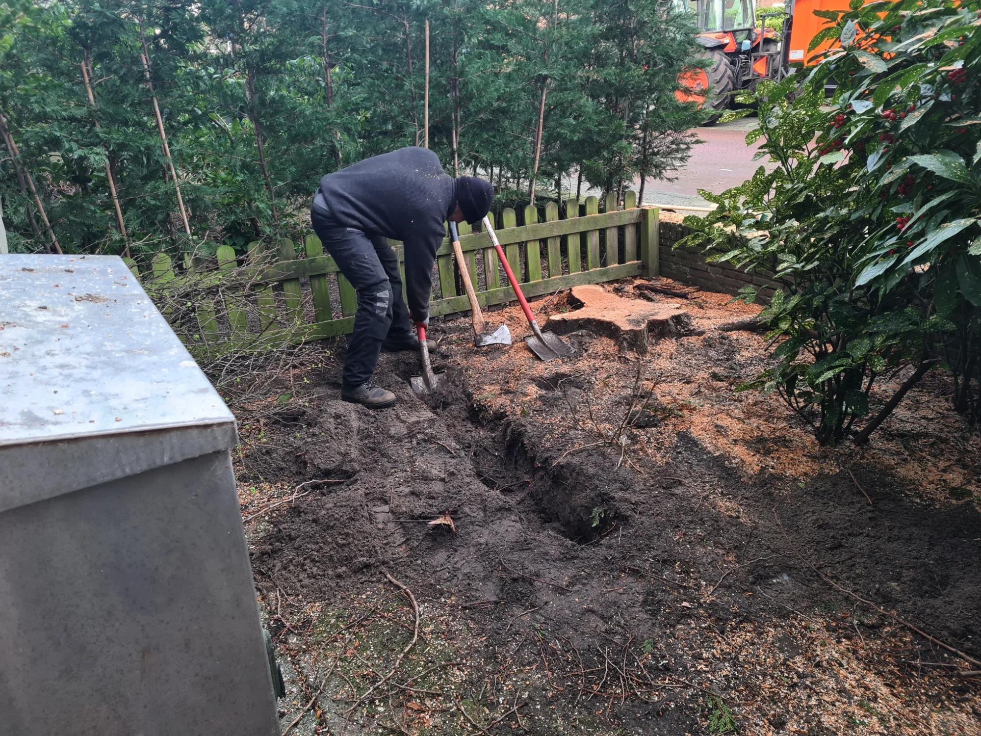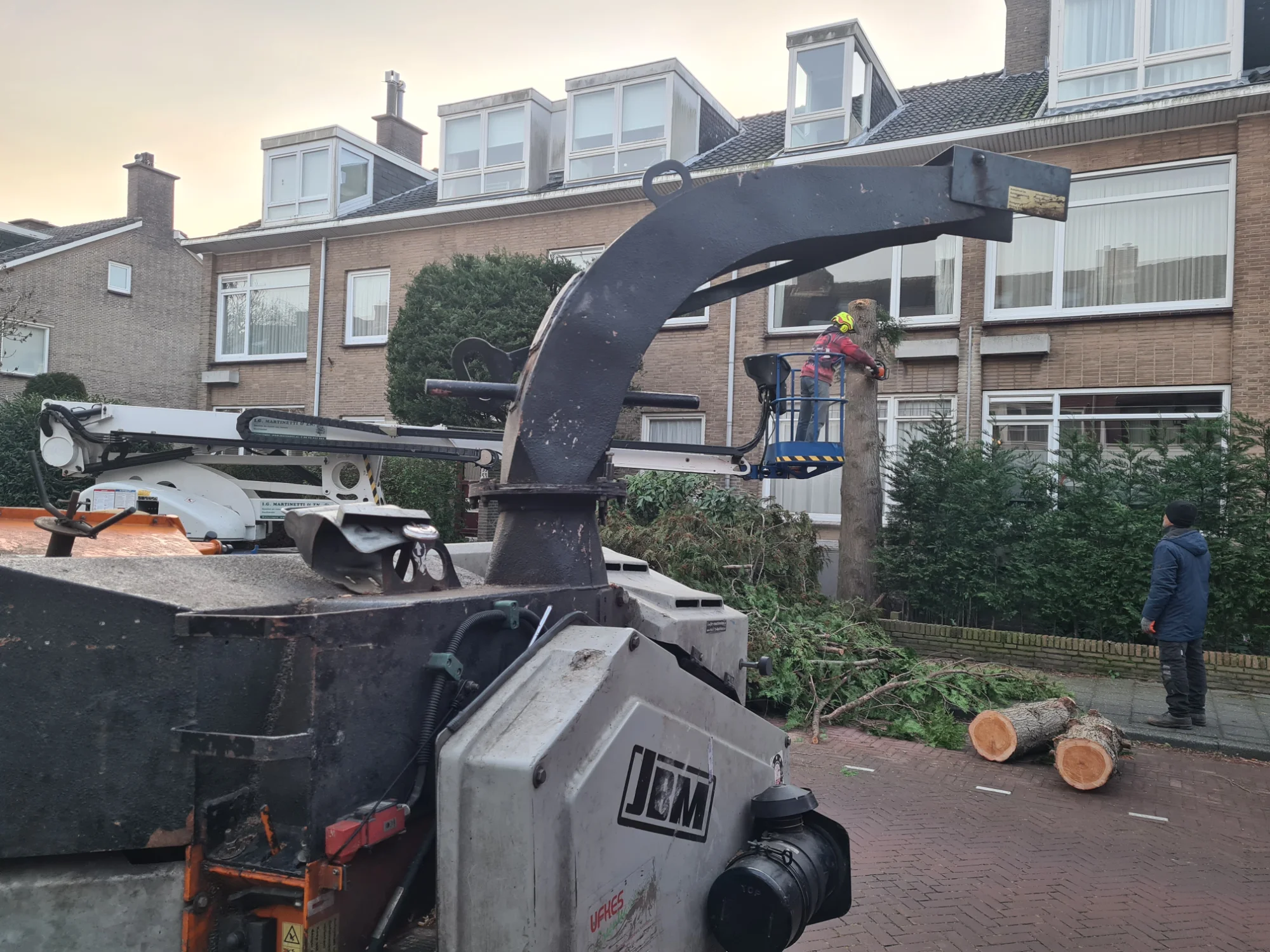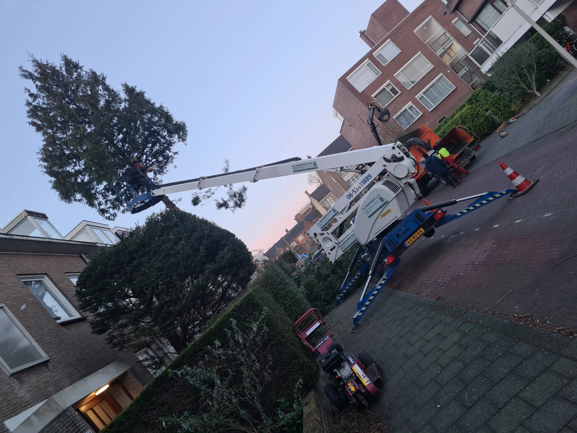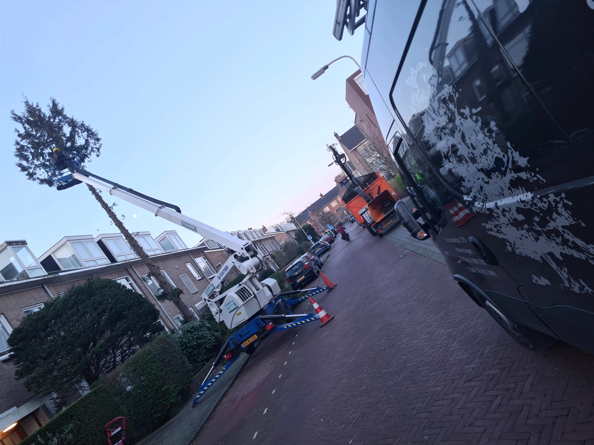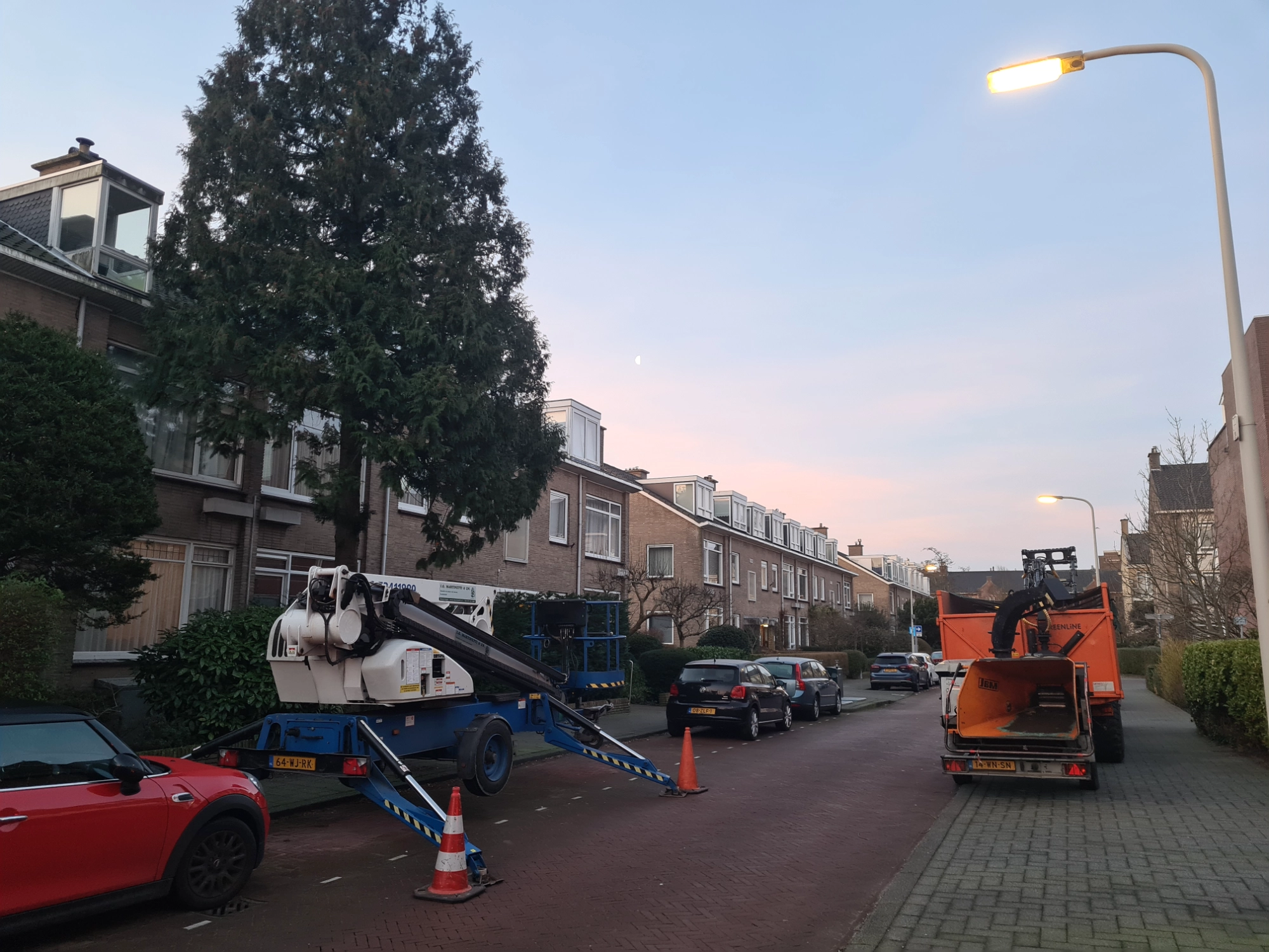 Vroeg uit de veren vandaag. Het rooien van een ruim 30 jaar oude Leylandii (conifeer) in de Ary Schefferstraat te Den Haag stond op het programma. De boom werd te groot voor deze kleine voortuin en gaf overlast aan bewoners van het appartementencomplex. Verder opkronen was geen optie meer. De gemeente Den Haag had voor deze boom een kapvergunning afgegeven. De boom is met behulp van een Nifty hoogwerker in delen naar beneden gehaald. Voor het frezen van de stronk is een proefsleuf gegraven in verband met een aanwezige gasleiding. Een kleine loofboom wordt binnenkort terug geplant zodat de voortuin er weer groen gaat uitzien. Want wij planten natuurlijk liever bomen dan dat wij ze weghalen!